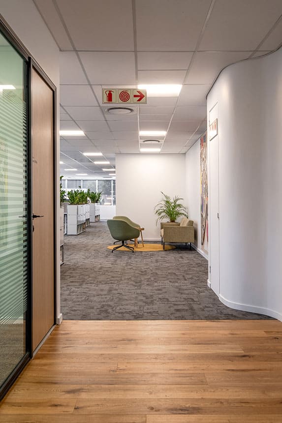 Every detail was carefully considered to balance functionality with design quality, meeting acoustic requirements to ensure privacy for confidential discussions. The kitchen was also completely redesigned, incorporating sophisticated finishes such as linoleum and Fenix surfaces.