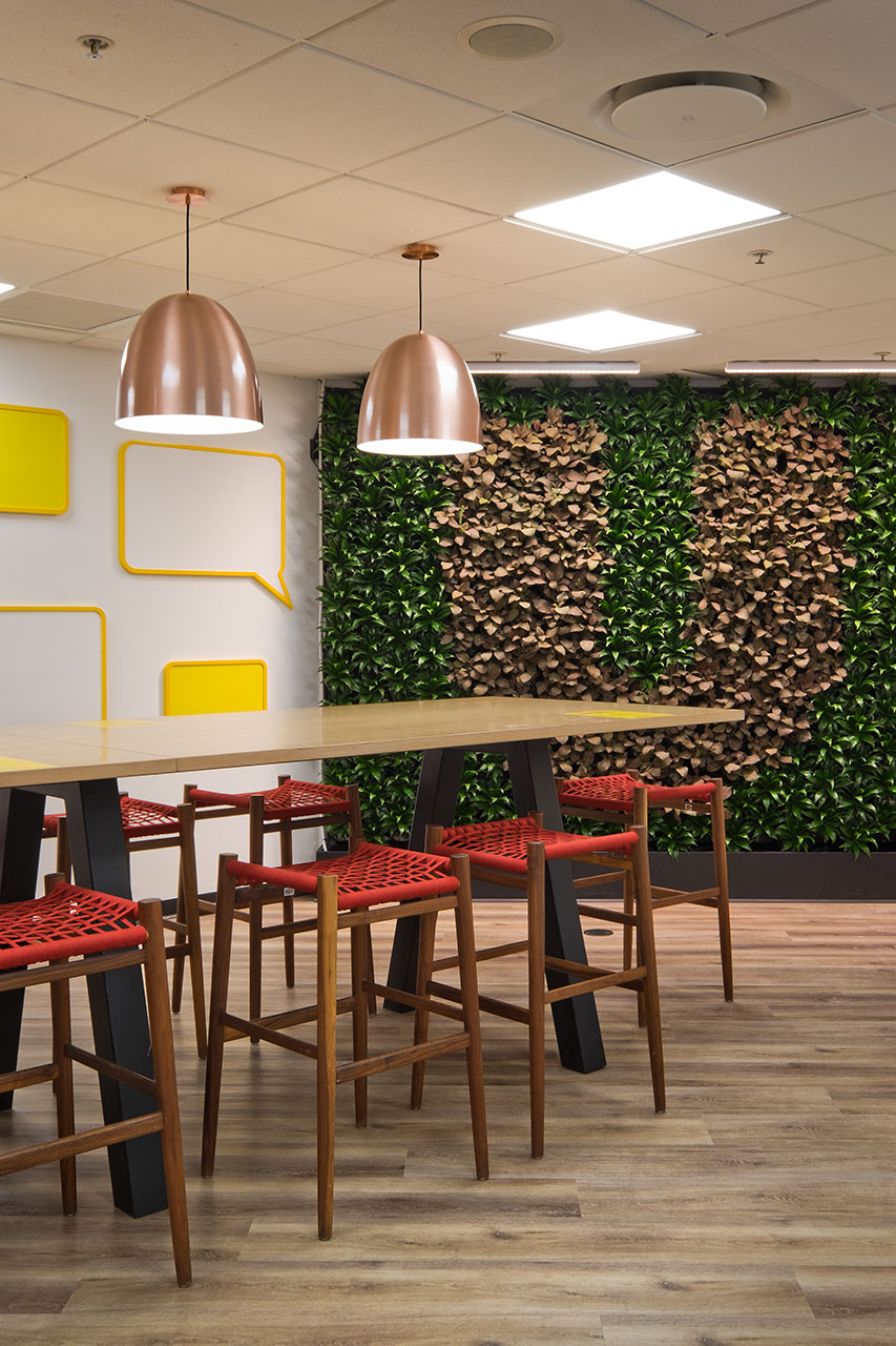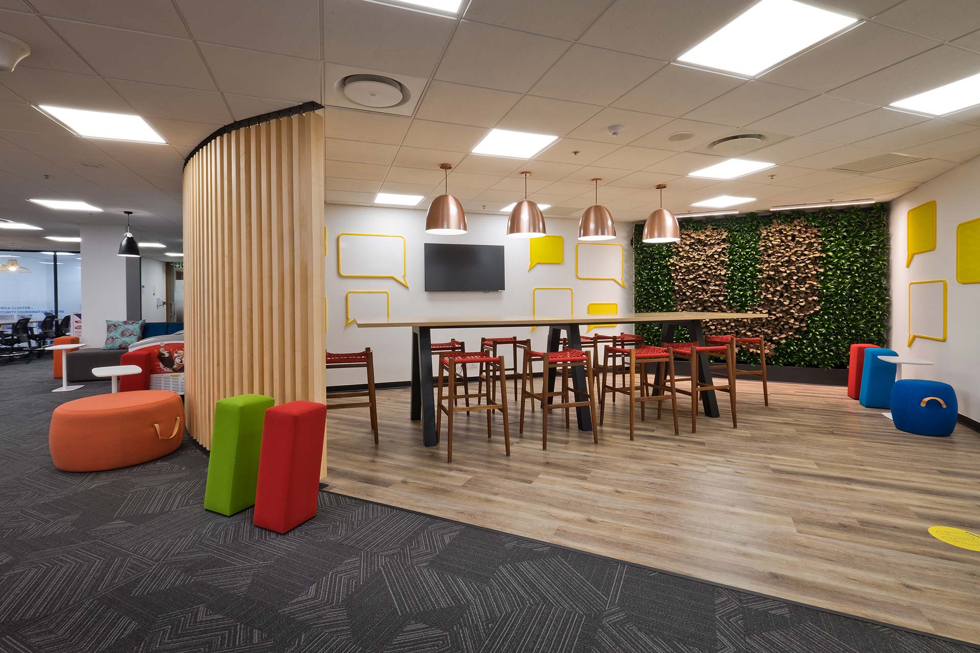 Through meaningful engagement with employees, the project set out to design a workplace that truly supports and motivates their daily routines. The new office features an industrial-inspired aesthetic enriched with bold African influences that highlight local culture and authenticity. A lively mix of colours, distinctive furniture selections, and abundant greenery brings warmth and energy to the space, resulting in a vibrant and uplifting environment.